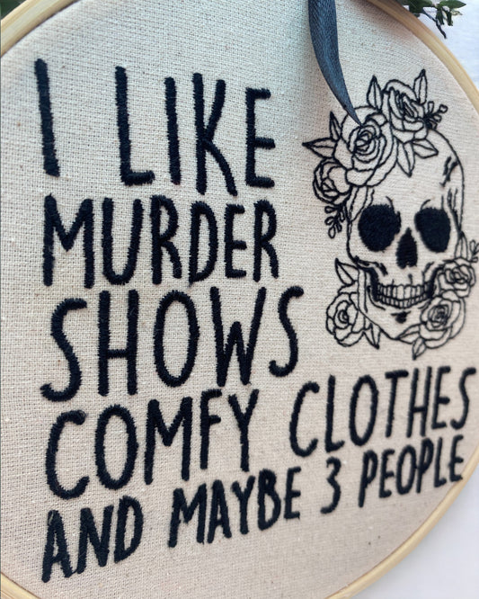 I Like Murder Shows, Comfy Clothes and Maybe 3 People Embroidered Wall Art