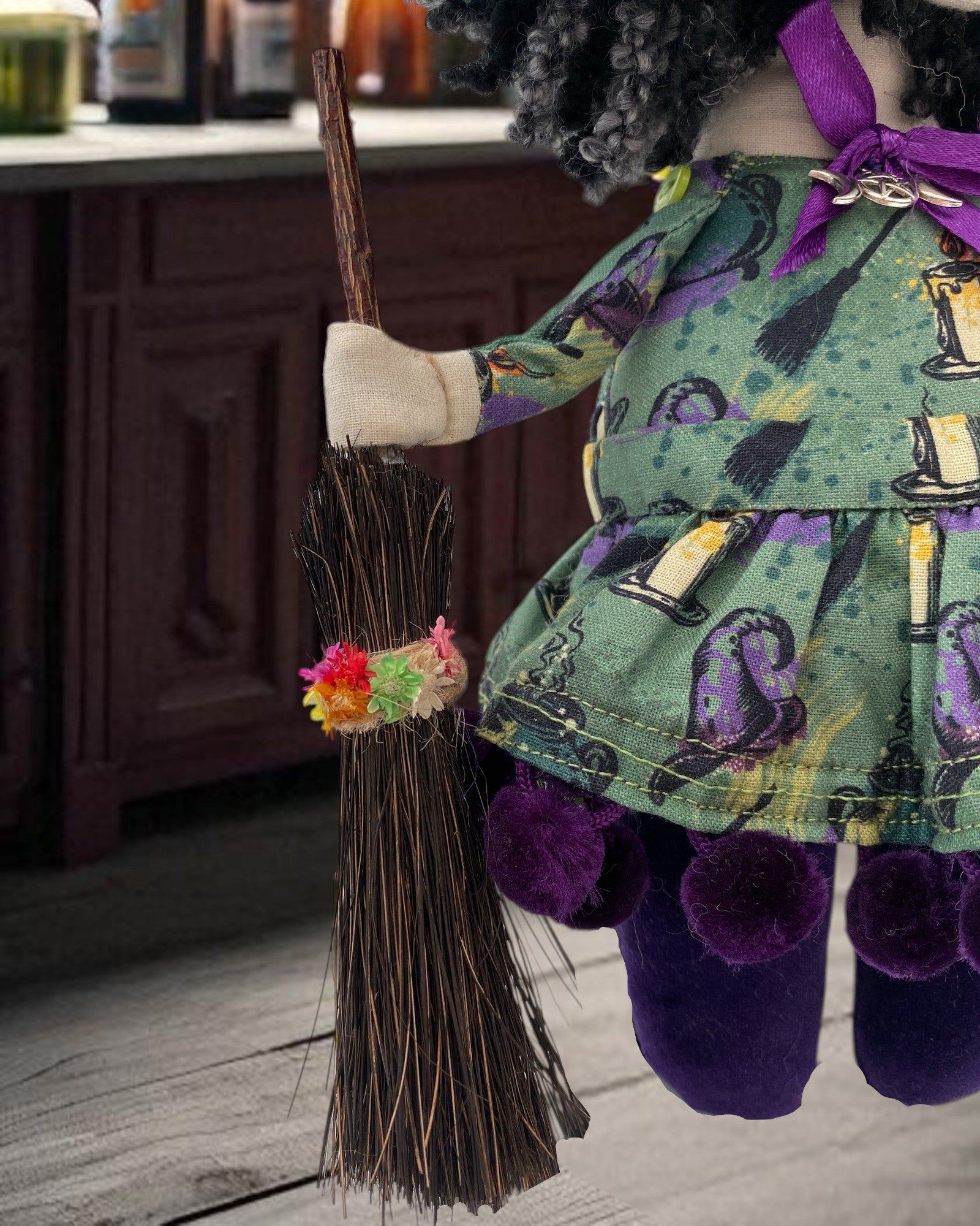 The fabric of her dress contains candles, cauldrons, witch hats and brooms in a cartoon design, with an embroidered lace hat on her head and a handmade broom in her hand.